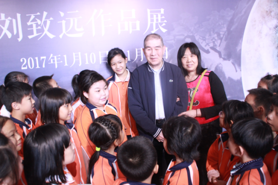 展覽現(xiàn)場,高勵(lì)節(jié)與以其父親名字命名的“劍父小學(xué)”學(xué)生們合影