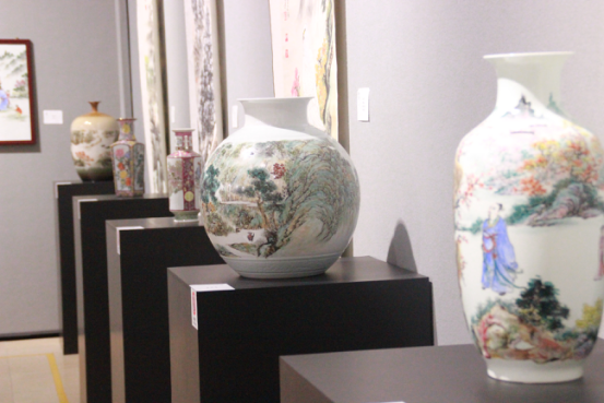 劉致遠(yuǎn)作為國畫、廣彩陶藝大師劉群興之子,也自幼隨父學(xué)習(xí)國畫及陶瓷制作,其廣彩作品色澤鮮明,絢麗多彩,既師吸收統(tǒng)繪畫技法,又仿造西洋畫法,頗具嶺南畫派折衷中西的精髓。其國畫松樹題材的創(chuàng)作,盡顯崇山峻嶺之中,松之勁峭與水之嫵媚,其繪制的山水題材彩瓷既有山河磅礴之態(tài)勢、又具匠心細(xì)刻之精致。此次兩位嶺南畫派傳承人在此展出他們的作品,內(nèi)容、風(fēng)格各異,交相輝映,很好地承傳了嶺南畫派的要義。