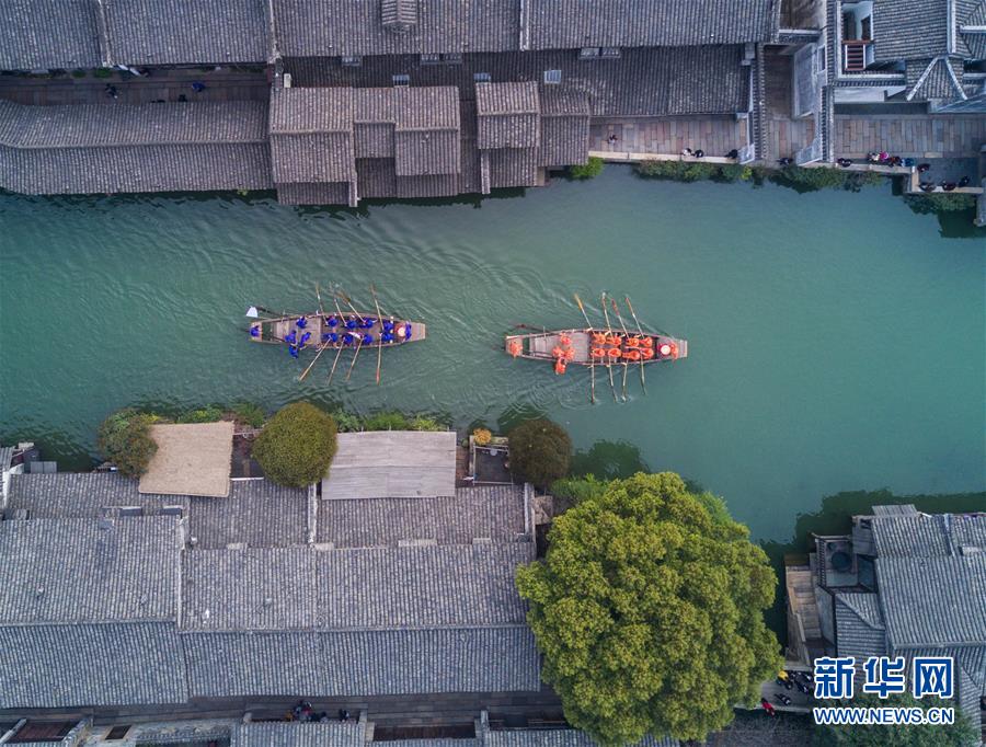 3月29日,烏鎮(zhèn)水鄉(xiāng)百姓在烏鎮(zhèn)西柵景區(qū)參加名為“踏白船”的傳統(tǒng)水上競技活動,吸引游客前來感受水鄉(xiāng)獨特的民俗風(fēng)情?!疤ぐ状备傎惖哪康氖菫榱似砬笮Q桑豐收。