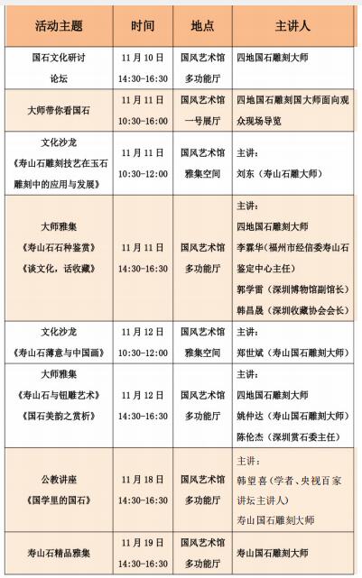 不僅如此,來自四地的國家級(jí)、省級(jí)工藝美術(shù)大師、非物質(zhì)文化遺產(chǎn)傳人將親臨深圳, 展覽期間,舉辦名家對(duì)話論壇,開設(shè)兩場(chǎng)名石雕刻藝術(shù)公開講座,另逢周末將特邀兩位國石大師在現(xiàn)場(chǎng)為觀眾導(dǎo)賞。