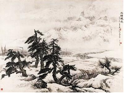 據(jù)介紹,《北國風光》既有著關山月招牌的寫實之風——將筆情墨趣融進寫生之中,又表現(xiàn)了毛澤東詞作《沁園春·雪》的浪漫豪放。一如與傅抱石合作的《江山如此多嬌》,關山月在該畫中采用了更博大豪邁的橫幅構(gòu)圖。西畫中的焦點透視法在此幅中非常精彩而寫實地表現(xiàn)了遠中近處的景觀:近處,荒原上的尚未融化的白雪,挺立其上的幾顆老松,與《江山如此多嬌》中前景的松樹一樣,畫家以長期歷練的寫實手法表現(xiàn)松之偉岸雄厚和不畏嚴寒,躍然而出的是一種英雄浪漫主義情懷。至于遠山和云海,畫法與《江山如此多嬌》中的遠山云海如出一轍,畫法甚至更為成熟,也更為瀟灑。