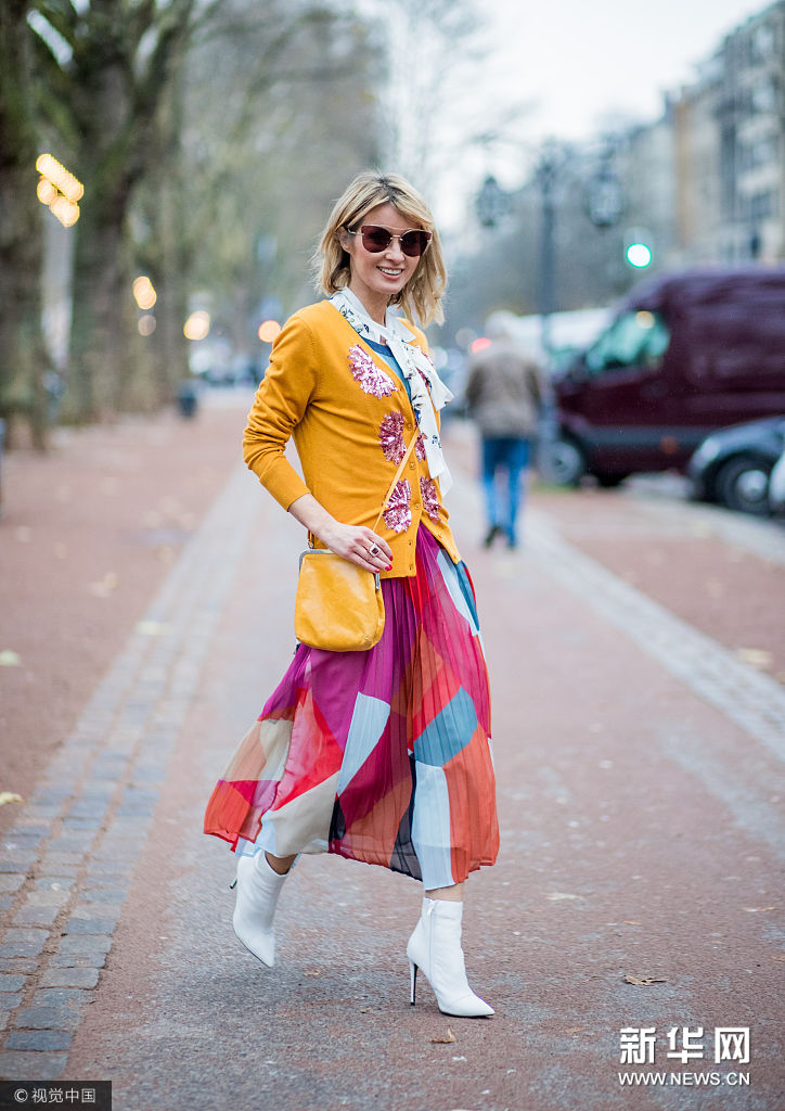 ??? 近日,德國杜塞爾多夫,時尚博主Gitta Banko街拍。她戴Miu Miu茶色墨鏡,身穿Steffen Schraut橘色亮片拼貼針織開衫,內(nèi)搭Steffen Schraut白色蝴蝶印花系帶雪紡襯衫,Steffen Schraut拼色百褶紗裙,肩背Volker Lang橘色口金包,腳踩Kurt Geiger白色尖頭高跟短靴。