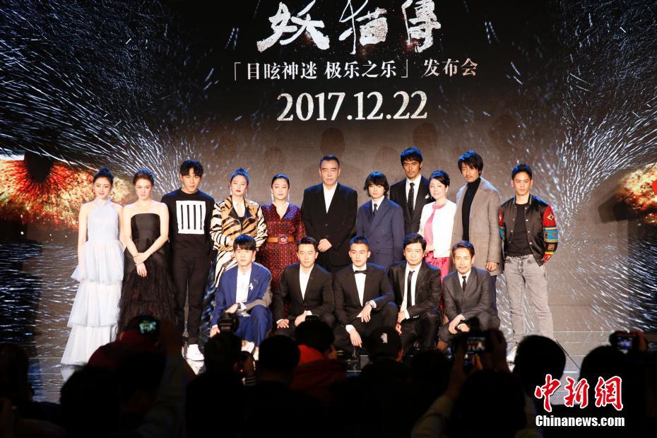 12月17日,由陳凱歌導(dǎo)演的賀歲奇幻題材電影《妖貓傳》在北京舉行全球首映發(fā)布會(huì),導(dǎo)演陳凱歌,制片人陳紅攜主演黃軒、染谷將太、張雨綺、秦昊、張榕容、張魯一、劉昊然、阿部寬、松坂慶子等亮相。影片改編自日本作家夢(mèng)枕貘的魔幻系列小說《沙門空?!罚瑢⒂?2日起在中國內(nèi)地上映。圖為眾主創(chuàng)合影。