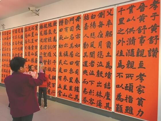 據(jù)了解,此次展覽不同于普通的書法展,而是以“孝德”為內(nèi)容的主題創(chuàng)作展,所有作品都圍繞孝文化進(jìn)行創(chuàng)作,每一幅作品都在講述一個(gè)關(guān)于孝文化的故事。在“孝德”大主題下,又分了幾個(gè)小專題,比如“二十四孝專題”“孝經(jīng)專題”“金石題跋專題”,還有本土的“孝德寶安專題”。當(dāng)天的展覽吸引了大量觀眾,不少觀眾還帶著小孩參觀,黃女士告訴記者,“今天帶著小孩來,一是欣賞書法,二是希望小孩了解一下傳統(tǒng)的孝德文化,我們通過書法還了解到寶安孝子黃舒的故事?!?/p>