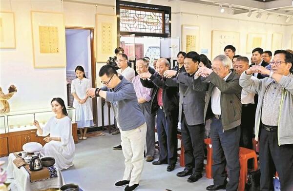 絲竹管弦伴著《詩經(jīng)》吟誦,古雅之風(fēng)貫穿了古今。當(dāng)天除了慕雅思古之外,亦有崇賢。參加活動(dòng)的眾人,向書圣王羲之的畫像作揖、致敬。羅烈杰、盧紹武、李靜現(xiàn)場做了熱情洋溢的講話,他們鼓勵(lì)書界同仁要團(tuán)結(jié)努力,既要繼承傳統(tǒng)、又要推陳出新,不斷弘揚(yáng)中華民族的優(yōu)秀文化。禮畢后,著名古琴家高建國現(xiàn)場操琴。除此之外,還有精彩的茶藝、二胡表演等等。
