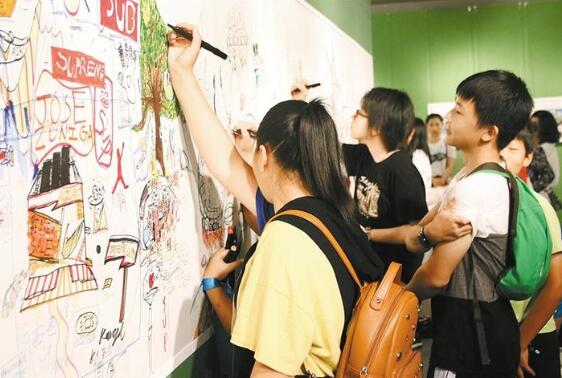 參加繪畫創(chuàng)作的馮羿飛小朋友說:“作為一名深圳孩子,我感覺自己非常幸運(yùn)。我們生活在這個(gè)美麗、有激情、有活力的國際化城市,在成長過程中也見證了她的變化?!眳⒓赢嬚沟男‘嫾覀儸F(xiàn)場集體創(chuàng)作了《未來深圳》10米長卷,此次畫展的作品被編印成精美畫冊。(記者 張賀敏文/圖)