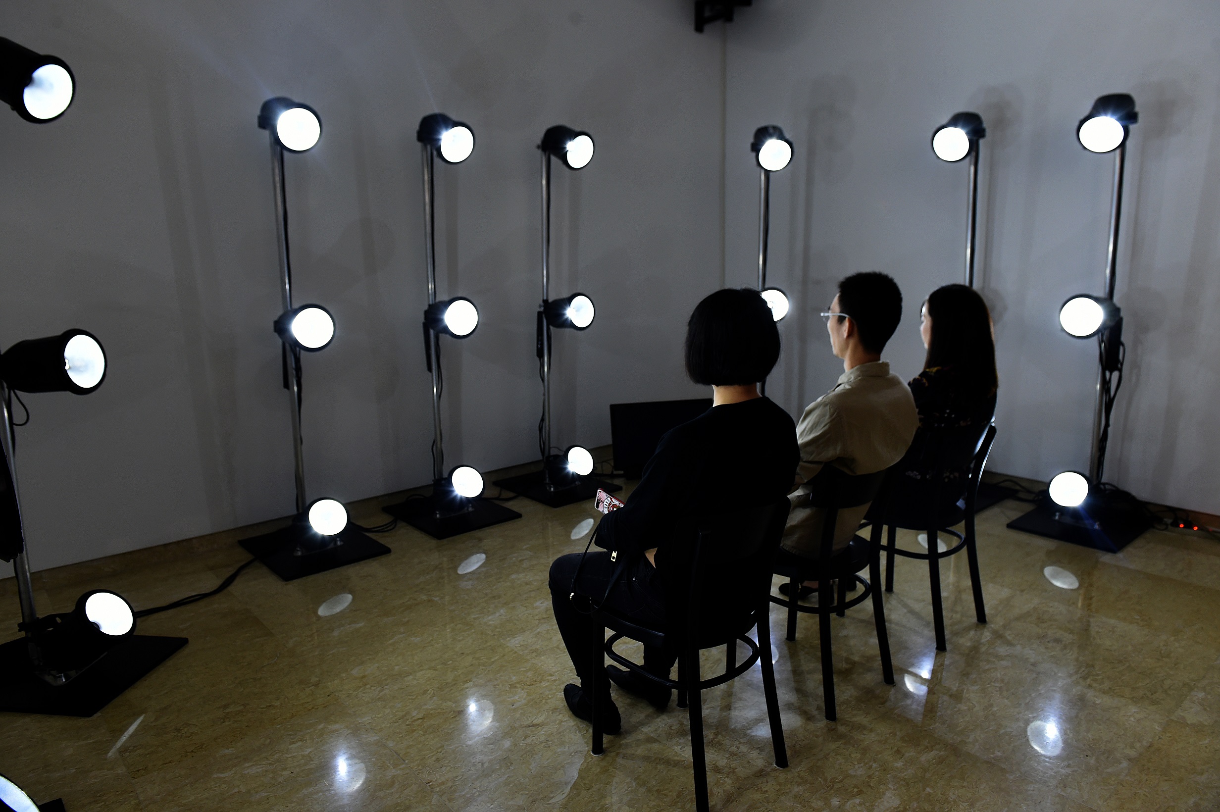 很多觀眾排隊體驗丹麥館的《斷電》,它由27根頻閃觀測器燈圍著三張座椅。觀眾坐下,閉上眼睛……通過預設好的燈光順序,閉上眼睛眼前將會呈現(xiàn)幾乎會引起幻覺的燈光圖案。同音樂一起,制造了一場浸入式的感官體驗。通過調(diào)動眼球與大腦的敏感性,看它們?nèi)绾萎a(chǎn)生視覺“斷電”。