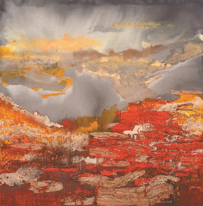 近年來(lái),鄒明也嘗試用綜合材料來(lái)表現(xiàn)都市水墨。此次展出的部分作品呈現(xiàn)了他在這一領(lǐng)域的成果。譬如《大漠殘陽(yáng)》《隙》《生命守望》等作品中可見(jiàn)他在材料上的大膽探索。這些作品用色大膽,筆觸粗獷,偏向當(dāng)代藝術(shù)。