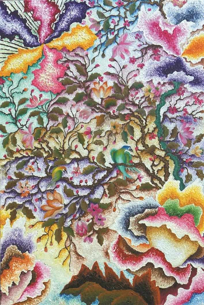 色彩是鄭澤生作品的一大亮點。這源自他第一份工作是在深圳增邦印花廠學調色,長期的訓練和刻苦的努力練就了他對色彩的敏感度。《消逝的香格里拉》這組作品可以說是他近期創(chuàng)作中布局最為精細、顏色最為豐富的代表作之一。畫面布滿圖騰式的形象,萬物共生。此時鄭澤生處理群像時顯現出一派欣欣向榮的景象,每一寸都散發(fā)著生命的光輝和絢爛。
