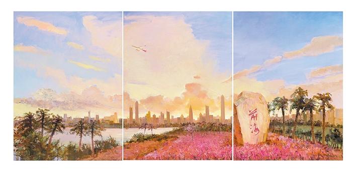 在創(chuàng)作中,文禎非用了現(xiàn)實(shí)的元素,前海標(biāo)志性石碑,棕櫚樹代表著南方特征,前海距離寶安機(jī)場(chǎng)很近,天空中的深航飛機(jī)象征著深圳開放的胸懷,遠(yuǎn)處平安大廈等標(biāo)志性現(xiàn)代化建筑一字排開,地面是深圳市花簕杜鵑……“這些都是深圳人熟悉的現(xiàn)實(shí)素材,在畫面展現(xiàn)時(shí)更多地把對(duì)深圳未來(lái)發(fā)展的憧憬和信心放入了畫面,調(diào)整了前海石碑與建筑的視覺關(guān)系,地面一片簕杜鵑是深圳創(chuàng)業(yè)初期英雄主義激情的象征,更代表著新時(shí)期深圳創(chuàng)新創(chuàng)造的活力與熱情;現(xiàn)代建筑的背景也預(yù)示著深圳40年來(lái)的成就也為前海發(fā)展提供了堅(jiān)實(shí)基礎(chǔ);早晨天空中朝霞放射狀的光芒萬(wàn)丈,表達(dá)了對(duì)未來(lái)的憧憬……”文禎非滔滔不絕中透露出創(chuàng)作時(shí)的激情。