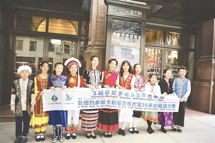 深圳飛越彩虹合唱團(tuán)11個(gè)小演員身著色彩紛呈的少數(shù)民族服裝放歌卡耐基音樂(lè)廳