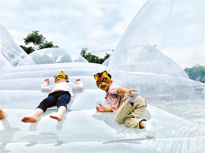 在本屆鳳凰花嘉年華主會場——華僑城體育文化中心綠地空曠自然的草坪上,由本土新銳建筑設(shè)計師黃澤林設(shè)計和創(chuàng)作的巨型充氣建筑“空氣山”拔地而起。人們可以自由地在“空氣山”的多維表面上嘗試坐、臥、立、躺的體驗。而張凱琴、張齊努、劉小青三位國內(nèi)知名自然藝術(shù)家即興創(chuàng)作的“歇腳云”等自然裝置,通過空間藝術(shù)作品與公眾的互動,喚醒著人們對自然的熱愛。