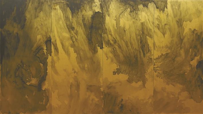 此次展出的作品《山外之山中》泥金四條屏令人耳目一新。他借助屏風的形式,使用泥金這一材料,以大開大闔的磅礴氣勢,展現(xiàn)了蘇軾筆下“不識廬山真面目,只緣身在此山中”的意境。