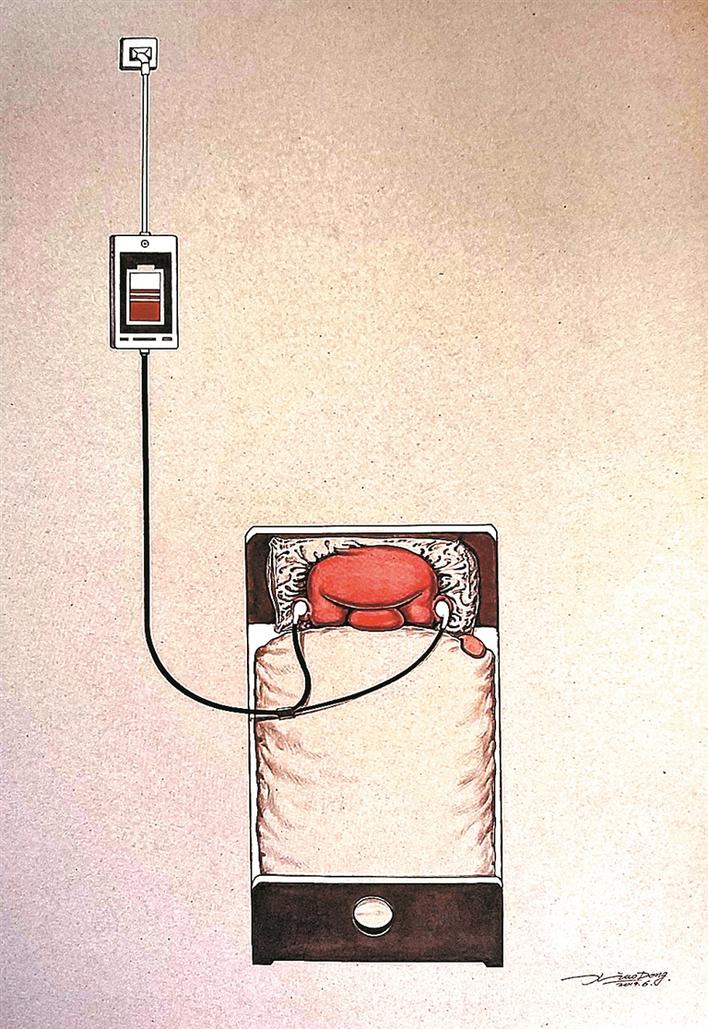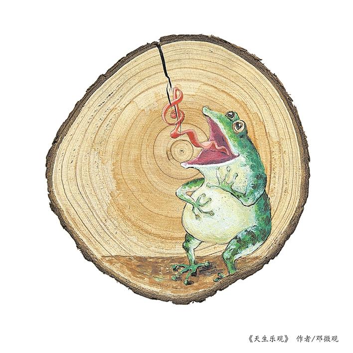 上榜漫畫家鄧微觀系深圳市寶安區(qū)打鐵文藝社社長(zhǎng),其《感物系列》以見物興感為主線,展開豐富的想象力,用動(dòng)物擬人的方式幽默詼諧地抒發(fā)人生感悟,讓人會(huì)心一笑之余引起共鳴,令觀眾感嘆藝術(shù)家的漫無邊際的“腦洞”。對(duì)于作品首次入選國內(nèi)美術(shù)界規(guī)格最高的國展,鄧微觀很興奮:“這是對(duì)我這個(gè)系列作品的高度肯定。”《感物系列》系列作品源于他閑逛發(fā)呆時(shí)的想象碎片,將這個(gè)碎片貫穿就成了這個(gè)系列作品。鄧微觀在茶余飯后經(jīng)常到鐵崗的西鄉(xiāng)河邊散步,河中不時(shí)傳來低頻厚實(shí)的“男低音”引起他的注意,此起彼伏,聽來如交響曲一般通達(dá)舒暢。他循聲尋覓,原來是蛤蟆的聲音,只見這些“音樂家”在下水道洞口,在草叢中,河道縫中快樂地歡唱……這些天生的樂觀者給鄧微觀帶來美妙的心情,所以創(chuàng)作了這幅《天生樂觀》。再如《三餐之余》,有時(shí)飯后經(jīng)常會(huì)在茶幾前發(fā)發(fā)呆,思考人生不應(yīng)該只是面包和蘋果,還應(yīng)有點(diǎn)別的……