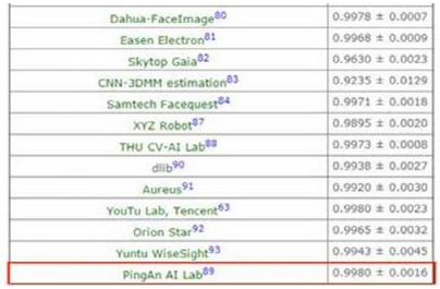 5月9日,國際權(quán)威人臉識別數(shù)據(jù)庫LFW(Labeled Faces in the Wild)最新公布的測試結(jié)果顯示,平安集團(tuán)旗下平安科技的人臉識別技術(shù)以99.8%的識別精度和最低的波動幅度領(lǐng)先國內(nèi)外知名公司,位居世界第一。該精度為LFW所公布的最佳成績,也是平安科技人工智能實(shí)驗(yàn)室取得的里程碑式成果。此外,經(jīng)國家公安部第三研究所認(rèn)證中心權(quán)威認(rèn)證,平安科技人臉識別技術(shù)同樣獲得識別精度99.84%的檢測結(jié)果,并榮獲檢測報(bào)告證書。