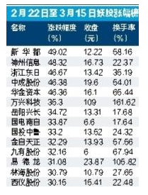 股市中有“三板成妖”一說。截至周四收盤,滬深兩市過去10個交易日,漲幅超過30%的股票有34只;過去5個交易日,漲幅超過30%的股票有15只。以上這些股票里,有一些連續(xù)上漲3個漲停以上,已經(jīng)“成妖”。那么,這些妖股有沒有一些共同點呢? 除少數(shù)次新股如萬興科技之外,絕大多數(shù)這類股票都經(jīng)過了一兩年下跌,股價處于低位,因這樣那樣原因得到資金關(guān)注而強力反彈。比如神州信息、浙江東日、中成股份、岳陽興長、國電南自、國投中魯、西儀股份等。