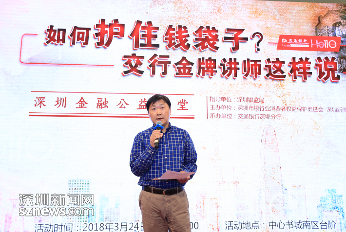 3月24日,在深圳中心書城南臺階,由深圳銀監(jiān)局指導,深圳新聞網(wǎng)、深圳市銀行業(yè)消費者權益保護促進會主辦,交通銀行深圳分行承辦的大型系列公益活動“深圳金融公益講堂”第四講如期開講?;顒友埩藖碜越煌ㄣy行深圳分行的三位金牌講師從專業(yè)角度為市民朋友們詳細講解理財知識,現(xiàn)場解答市民的金融消費困惑。