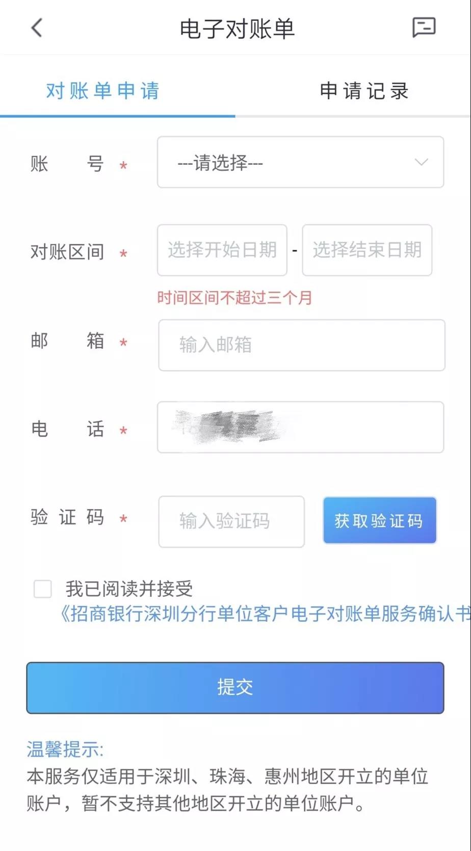 點(diǎn)擊電子對(duì)賬單,填寫對(duì)賬單申請(qǐng),輸入查詢賬號(hào)和日期、接收郵箱,獲取短信驗(yàn)證碼,點(diǎn)擊提交。