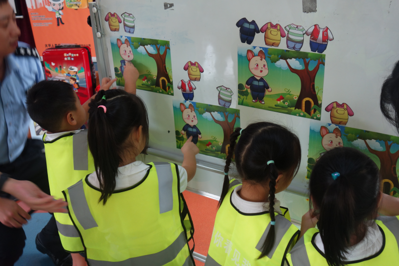 熊警官從交通工具講起,分別講述了乘坐不同交通工具所帶來的風(fēng)險(xiǎn)及注意事項(xiàng),并通過幽默風(fēng)趣的“兒童安全座椅”小視頻,提醒在座的小朋友及家長要注意細(xì)節(jié),具有防范風(fēng)險(xiǎn)的意識(shí)。在互動(dòng)游戲環(huán)節(jié),熊警官通過與小朋友們的互動(dòng),講解了紅綠燈的來源、日常的交通標(biāo)識(shí)以及過馬路的規(guī)則?,F(xiàn)場(chǎng)的同學(xué)們也非常踴躍,在“被看見才安全”環(huán)節(jié)時(shí),許多小朋友主動(dòng)上臺(tái),給小兔子穿上最亮最顯眼的衣服,使其成為最靚的仔。