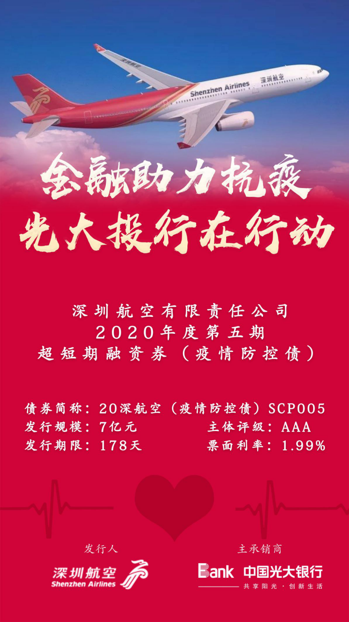 深圳新聞網(wǎng)2月12日訊 為積極響應(yīng)國(guó)家抗疫號(hào)召,支持疫情防控企業(yè)債券融資,光大銀行總行戰(zhàn)投部和深圳分行迅速反應(yīng),堅(jiān)決貫徹落實(shí)光大集團(tuán)及光大銀行總行黨委關(guān)于新型冠狀病毒肺炎疫情防控的有關(guān)要求,于2月11日成功發(fā)行深圳航空有限責(zé)任公司2020年度第五期超短期融資債券(疫情防控債) ,發(fā)行規(guī)模7億元,期限178天,票面利率僅為1.99%。其中,2億元募集資金將用于補(bǔ)充深圳航空為旅客免費(fèi)辦理退票、改期等支出產(chǎn)生的營(yíng)運(yùn)資金需求以及免費(fèi)提供防疫物資、醫(yī)療人員等運(yùn)輸產(chǎn)生的營(yíng)運(yùn)資金需求。