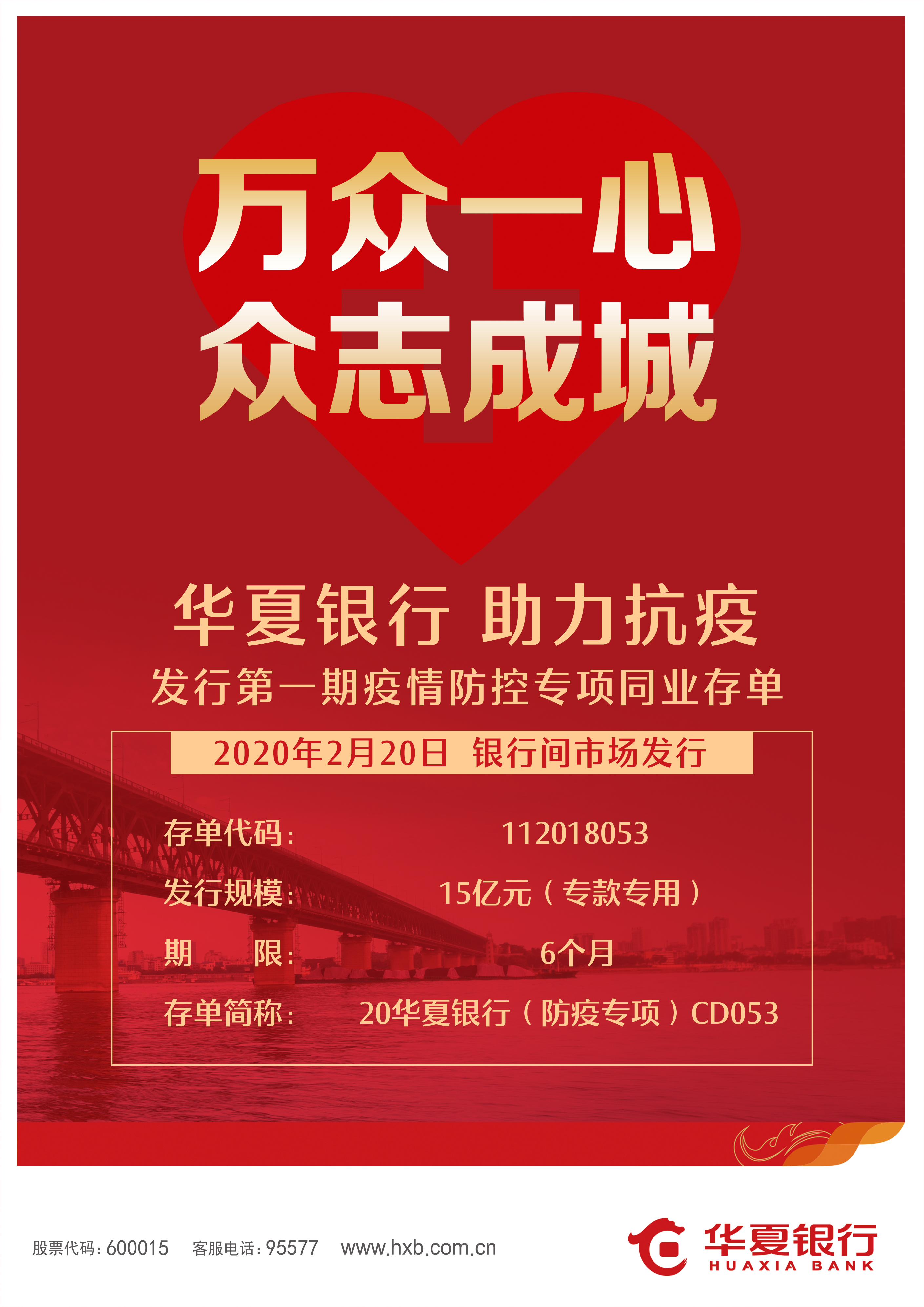 深圳新聞網(wǎng)2月20日訊 華夏銀行迅速響應(yīng)人民銀行疫情防控相關(guān)工作要求,于2月20日在全國銀行間市場成功發(fā)行疫情防控專項(xiàng)同業(yè)存單,為疫情防控提供資金支持。本期防疫專項(xiàng)存單發(fā)行規(guī)模15億元,發(fā)行期限6個(gè)月,發(fā)行利率2.40%,發(fā)行獲得了各類投資機(jī)構(gòu)的廣泛關(guān)注,投資者涵蓋城商行、農(nóng)商行、證券公司和基金公司等不同類型的20多家金融機(jī)構(gòu)。