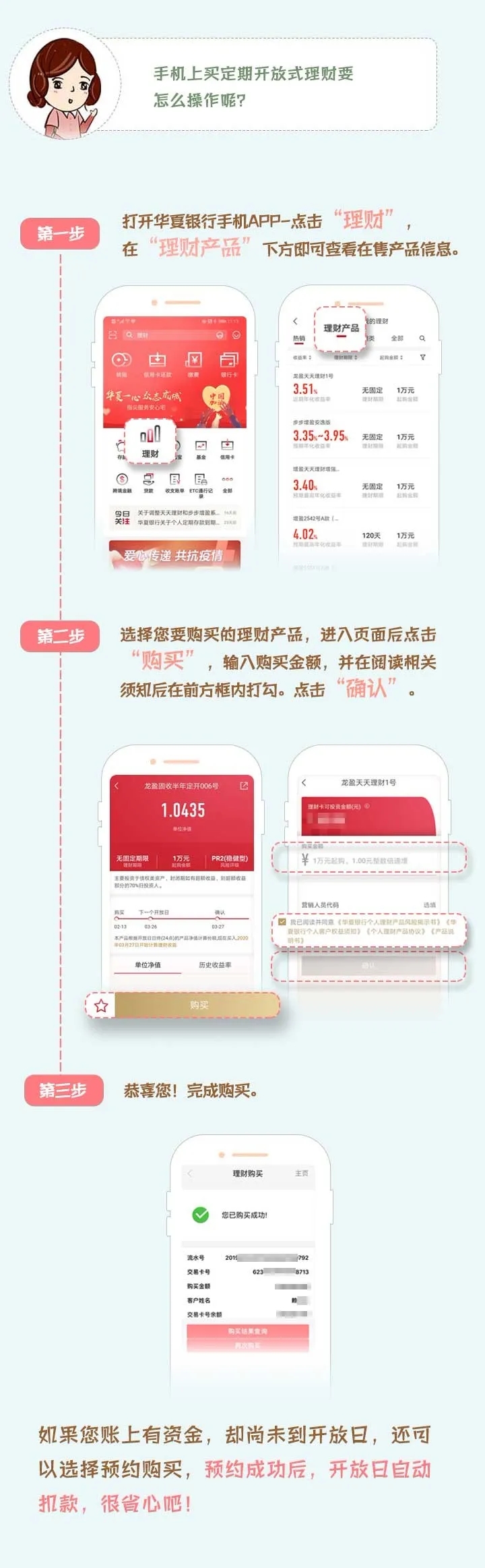 B:盡管足不出戶(hù),您依然能享受著華夏銀行便捷安全的線上服務(wù),開(kāi)展投資理財(cái)業(yè)務(wù),辦理理財(cái)產(chǎn)品、信托產(chǎn)品、代銷(xiāo)證券類(lèi)產(chǎn)品的認(rèn)申購(gòu)、贖回等。