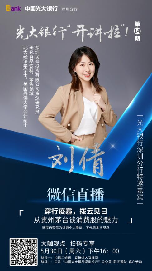 此次,光大銀行深圳分行攜手鳳凰深圳財(cái)經(jīng),邀請到北大經(jīng)濟(jì)學(xué)碩士、美國丹佛大學(xué)會(huì)計(jì)碩士、深圳民森投資有限公司資深研究員劉倩女士,在線為客戶帶來《穿行疫霾,拔云見日——從貴州茅臺(tái)看消費(fèi)股的魅力》主題分享。據(jù)悉,劉倩女士關(guān)注于食品飲料、零售領(lǐng)域的投資研究。此次分享,她以眾所熟知的茅臺(tái)酒為案例,結(jié)合A股2000年至2018年漲幅數(shù)據(jù)、茅臺(tái)歷史、品牌發(fā)展、銷售渠道、市場占有等多方面,介紹孕育牛股搖籃的消費(fèi)股投資邏輯,幫助更多客戶在全球受疫情沖擊、經(jīng)濟(jì)不確定時(shí)期,了解A股牛股市場邏輯、知曉投資策略提升個(gè)人資產(chǎn)。