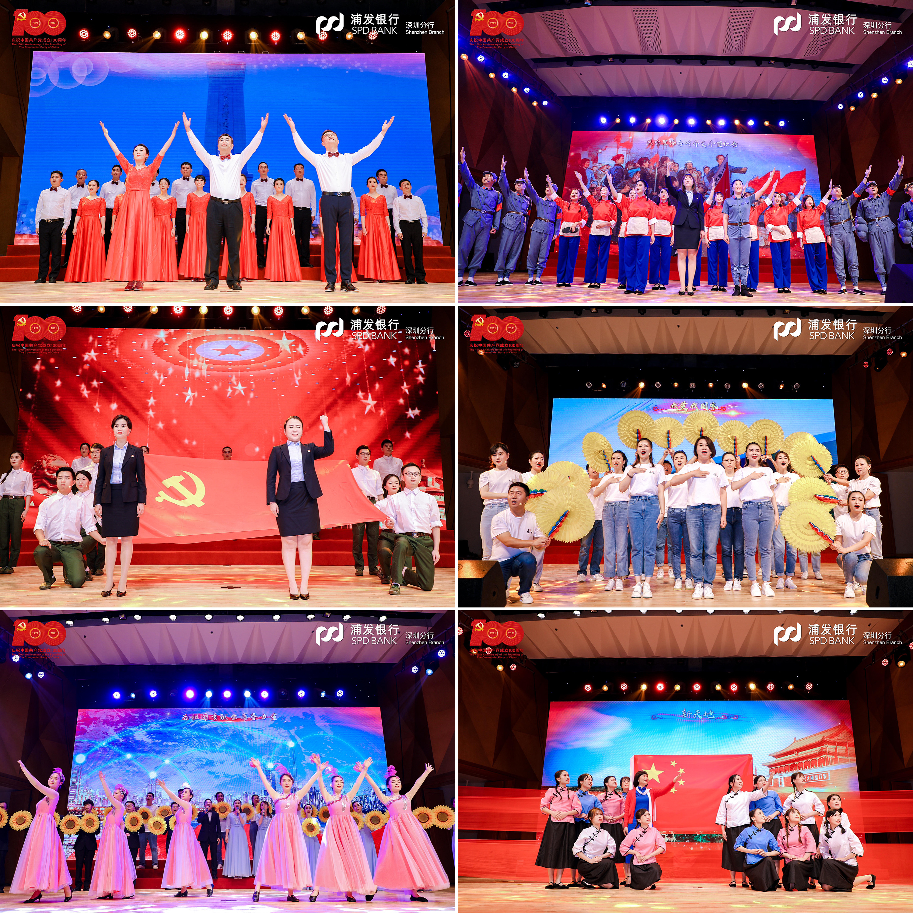 在黨支部風(fēng)采展示環(huán)節(jié),該行基層黨支部精心編排12首紅色經(jīng)典,通過(guò)4個(gè)篇章再現(xiàn)百年波瀾壯闊的偉大歷程。第一篇章“開(kāi)天辟地”演繹了中國(guó)共產(chǎn)黨在新民民主義革命時(shí)期完成救國(guó)大業(yè)的輝煌歷程,《保衛(wèi)黃河》吹響了高亢嘹亮的愛(ài)國(guó)號(hào)角,《十送紅軍》深情演繹血濃于水軍民情,《繡紅旗》一腔熱血帶著大家重回歌樂(lè)山。第二篇章“改天換地”回顧了中國(guó)共產(chǎn)黨在社會(huì)主義革命和建設(shè)時(shí)期完成興國(guó)大業(yè)的奮斗史詩(shī),《歌唱祖國(guó)》撥動(dòng)人們最難忘的記憶,《我們走在大路上》展現(xiàn)當(dāng)年敢闖敢拼的奮進(jìn)之姿態(tài),《唱支山歌給黨聽(tīng)》唱出人民心中永恒的贊歌。第三篇章“翻天覆地”再現(xiàn)了中國(guó)共產(chǎn)黨在改革開(kāi)放和社會(huì)主義現(xiàn)代化建設(shè)新時(shí)期推進(jìn)富國(guó)大業(yè)的光榮壯舉,《在燦爛陽(yáng)光下》重現(xiàn)春風(fēng)化雨之后的奮斗時(shí)光,《國(guó)家》打動(dòng)多少人的赤子之心,《我們的生活充滿(mǎn)陽(yáng)光》訴說(shuō)了改革開(kāi)放背后的喜悅。第四篇章“驚天動(dòng)地”展現(xiàn)了中國(guó)共產(chǎn)黨在中國(guó)特色社會(huì)主義新時(shí)代推進(jìn)并將在本世紀(jì)中葉實(shí)現(xiàn)強(qiáng)國(guó)大業(yè)的偉大時(shí)代,一首《天耀中華》是浦發(fā)人最深沉的表達(dá),《燈火里的中國(guó)》讓人漫步燈火漫卷的萬(wàn)里山河,《再一次出發(fā)》展示浦發(fā)追夢(mèng)者的雄姿英發(fā)。走過(guò)“百年風(fēng)雨”,浦發(fā)銀行深圳分行合唱團(tuán)一首《我和我的祖國(guó)》,蓬勃朝氣盡顯拳拳愛(ài)國(guó)心、濃濃赤子情。篇章結(jié)束,大家全體起立,高聲合唱《沒(méi)有共產(chǎn)黨就沒(méi)有新中國(guó)》,以最真摯最熱烈的歌聲獻(xiàn)禮建黨百年。