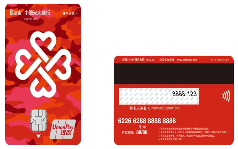 在金融服務產(chǎn)品方面,光大銀行面向軍人、退役軍人發(fā)行“擁軍優(yōu)撫”專屬聯(lián)名卡,優(yōu)撫對象可以憑軍官證、士兵證、退役證等有效證件在該行營業(yè)網(wǎng)點柜臺辦理賬戶開立并免收卡片工本費,“擁軍優(yōu)撫”專屬銀行卡在全國統(tǒng)一實現(xiàn)兩個專屬服務和十項優(yōu)惠政策。
