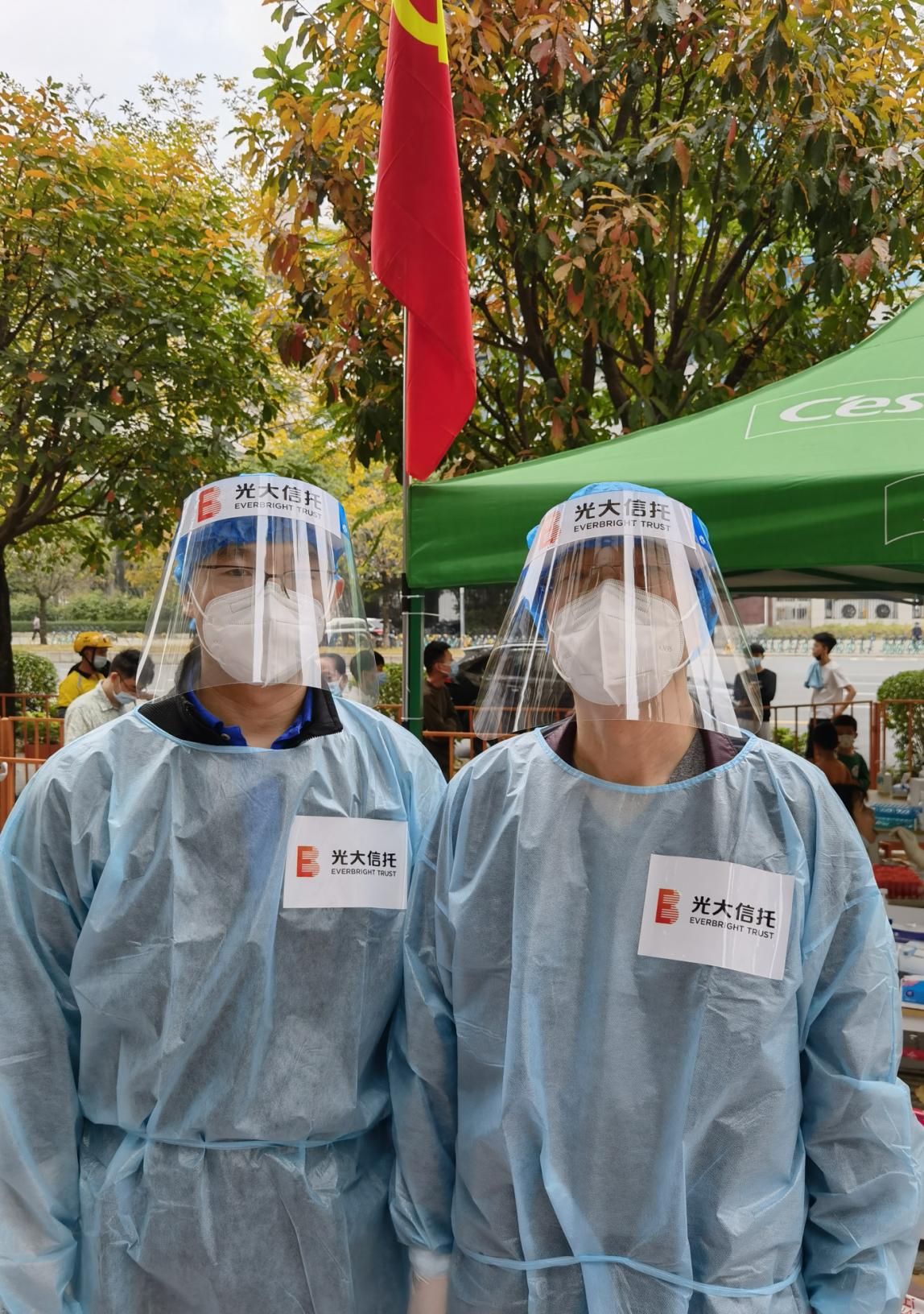 光大信托深圳區(qū)域黨支部在接到協(xié)同抗疫通知后,第一時(shí)間組織黨員和員工積極報(bào)名參與志愿服務(wù)。3月5日,恰逢毛澤東主席“向雷鋒同志學(xué)習(xí)”題詞的紀(jì)念日,光大信托公司風(fēng)險(xiǎn)總監(jiān)姚恒民同志以年近6旬的高齡,率先垂范的沖在一線,帶領(lǐng)深圳區(qū)域黨員同志們,投入福田區(qū)蓮花街道獅嶺社區(qū)的核酸檢測志愿服務(wù)工作,用實(shí)際行動(dòng)和赤誠情懷書寫共產(chǎn)黨員的責(zé)任和擔(dān)當(dāng)。當(dāng)天天氣炎熱,太陽暴曬下穿著防護(hù)服兩個(gè)小時(shí)工作下來,全身已完全濕透,但他們以飽滿的激情、負(fù)責(zé)任的態(tài)度詮釋了一個(gè)共產(chǎn)黨員在黨旗下宣誓的誓言。光大信托的一位黨員同志說:“疫情就是命令,防控就是責(zé)任,崗位就是戰(zhàn)場,每個(gè)服務(wù)點(diǎn)的黨旗就是一種信仰,每個(gè)黨員就是一面旗幟,每個(gè)黨支部就是一個(gè)堡壘,哪里有需要,哪里就有光大人的身影?!?/p>