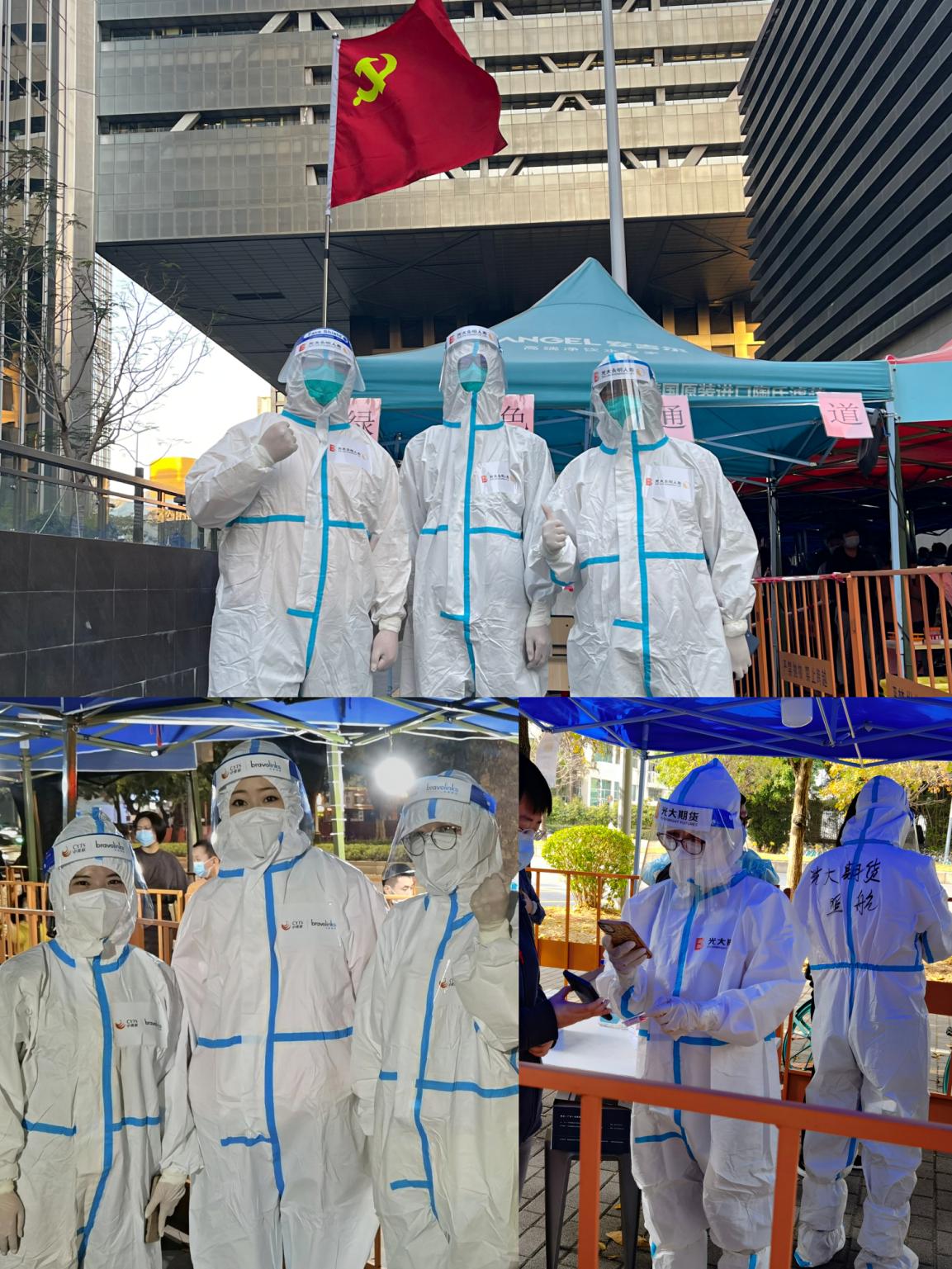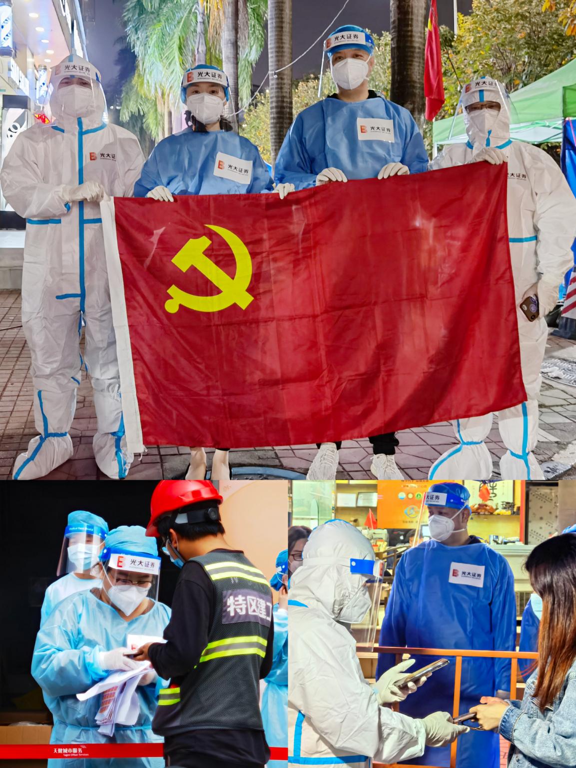 光大證券深圳分公司發(fā)揮基層黨組織戰(zhàn)斗堡壘作用和黨員先鋒模范作用,黨員干部迅速牽頭組建了“光證深分先鋒隊(duì)”,下沉基層抗疫一線,黨員同志們換上防護(hù)服、手套和隔離面罩深入蓮花街道多個(gè)社區(qū),全力協(xié)助醫(yī)護(hù)人員做好核酸檢測的輔助工作。從白天到黑夜的堅(jiān)守,頂著溫差很大的深夜寒風(fēng),保持良好狀態(tài),為廣大群眾的身體健康安全提供了有力保障。一句句暖心的提示、一個(gè)個(gè)忙碌的身影,光大證券深圳分公司的志愿者們,用實(shí)際行動(dòng),堅(jiān)定地守護(hù)著鵬城的人們!
