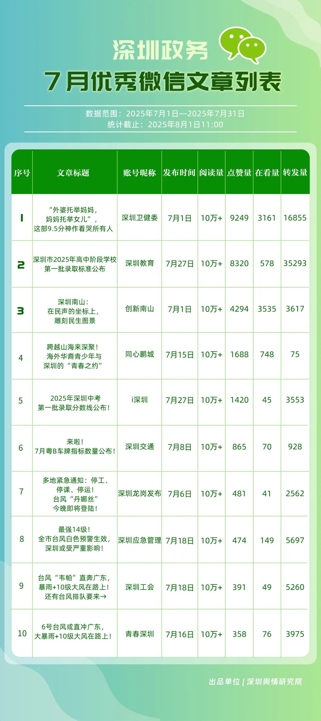 7月,30個(gè)政務(wù)微信公眾號(hào)入選“深圳優(yōu)秀政務(wù)微信公眾號(hào)”榜單,其中包括“深圳衛(wèi)健委”“深圳龍崗發(fā)布”“幸福福田”“創(chuàng)新南山”“i深圳”“深圳教育”“青春深圳”“深圳工會(huì)”“深圳光明”“濱海寶安”等。7月,“深圳衛(wèi)健委”內(nèi)容專(zhuān)業(yè)性與傳播力優(yōu)勢(shì)穩(wěn)固,整體表現(xiàn)保持較高水平,位于榜首;“深圳龍崗發(fā)布”聚焦民生服務(wù)與區(qū)域活動(dòng)宣傳,實(shí)現(xiàn)傳播效果提升,位居第二;“幸福福田”表現(xiàn)同樣不俗,排名第三?!皠?chuàng)新南山”“深圳教育”“深圳工會(huì)”等也積極發(fā)布高質(zhì)量信息與服務(wù)內(nèi)容,能夠較好平衡內(nèi)容“質(zhì)”與“量”,排名有所提升。上榜微信公眾號(hào)依托特色優(yōu)勢(shì)深耕內(nèi)容創(chuàng)作,將優(yōu)質(zhì)內(nèi)容作為核心支撐,成為政務(wù)傳播領(lǐng)域的優(yōu)秀典范。