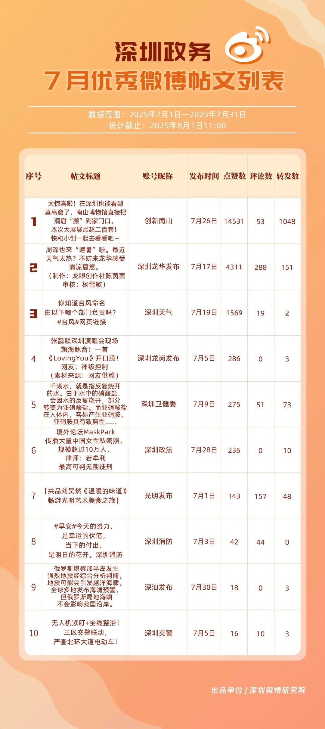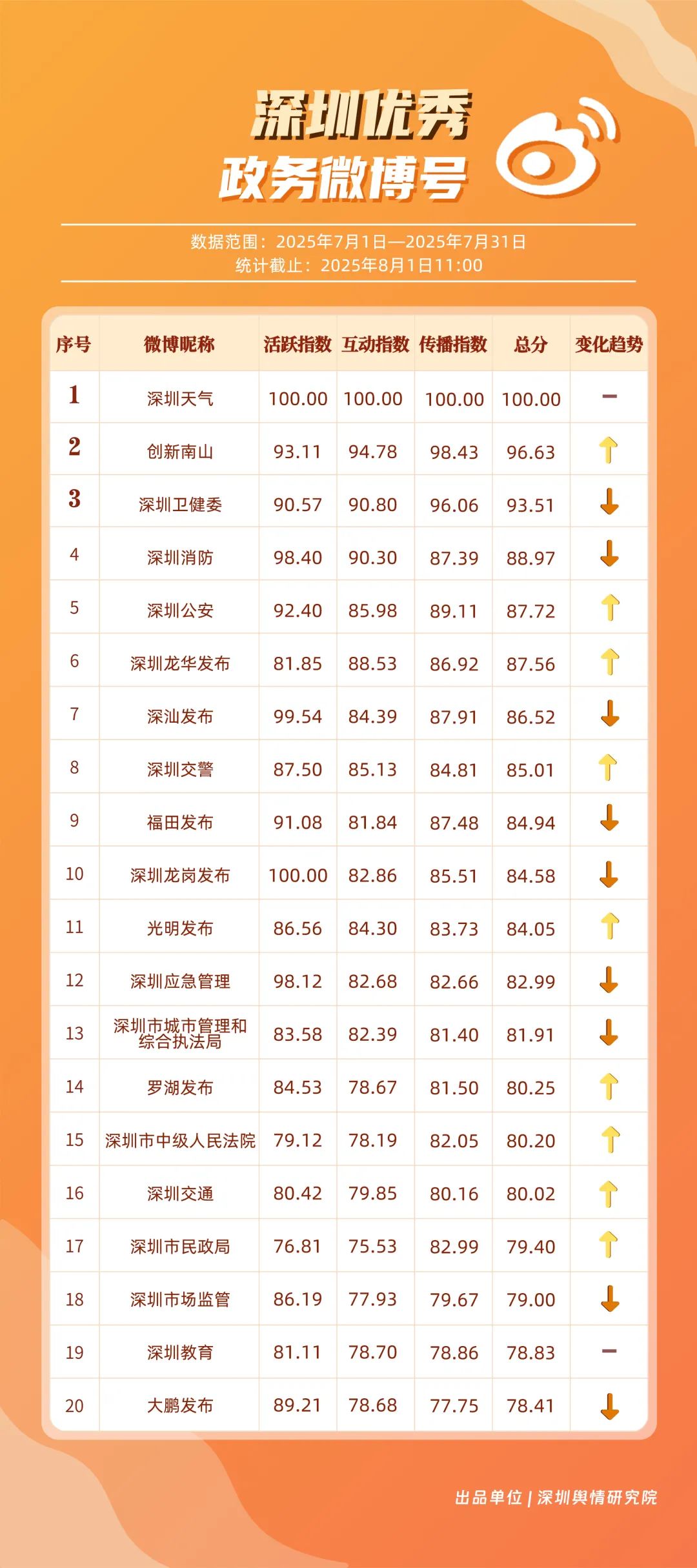 7月,“深圳天氣”“創(chuàng)新南山”“深圳衛(wèi)健委”“深圳消防”“深圳公安”“深圳龍華發(fā)布”“深汕發(fā)布”“深圳交警”“福田發(fā)布”“深圳龍崗發(fā)布”等20個(gè)賬號(hào)入選“優(yōu)秀政務(wù)微博號(hào)”。其中,“深圳天氣”以活躍、互動(dòng)、傳播指數(shù)三項(xiàng)滿(mǎn)分,蟬聯(lián)榜首;“創(chuàng)新南山”以總分96.63躍居第二,排名呈上升趨勢(shì);“深圳衛(wèi)健委”位列第三,評(píng)分也在90分以上,其科普信息持續(xù)獲得市民廣泛認(rèn)可。以上優(yōu)秀的政務(wù)微博賬號(hào)精準(zhǔn)貼合平臺(tái)的傳播規(guī)律,用獨(dú)特的賬號(hào)風(fēng)格展現(xiàn)各自特色與魅力。