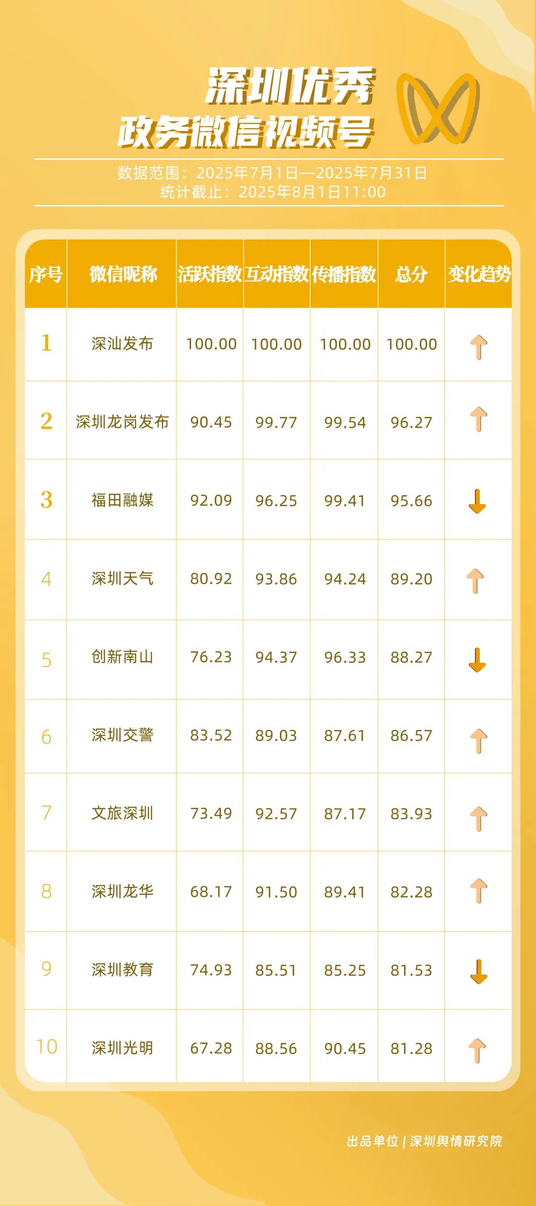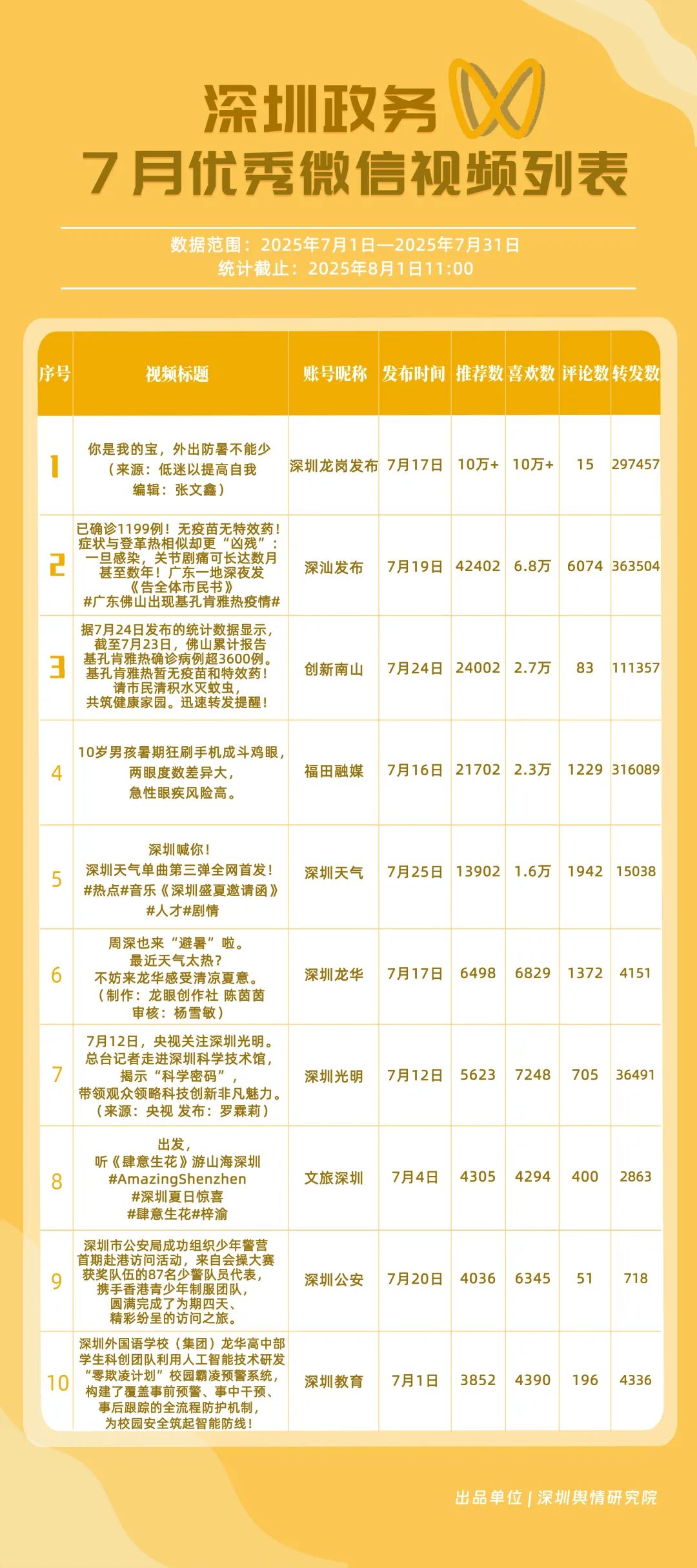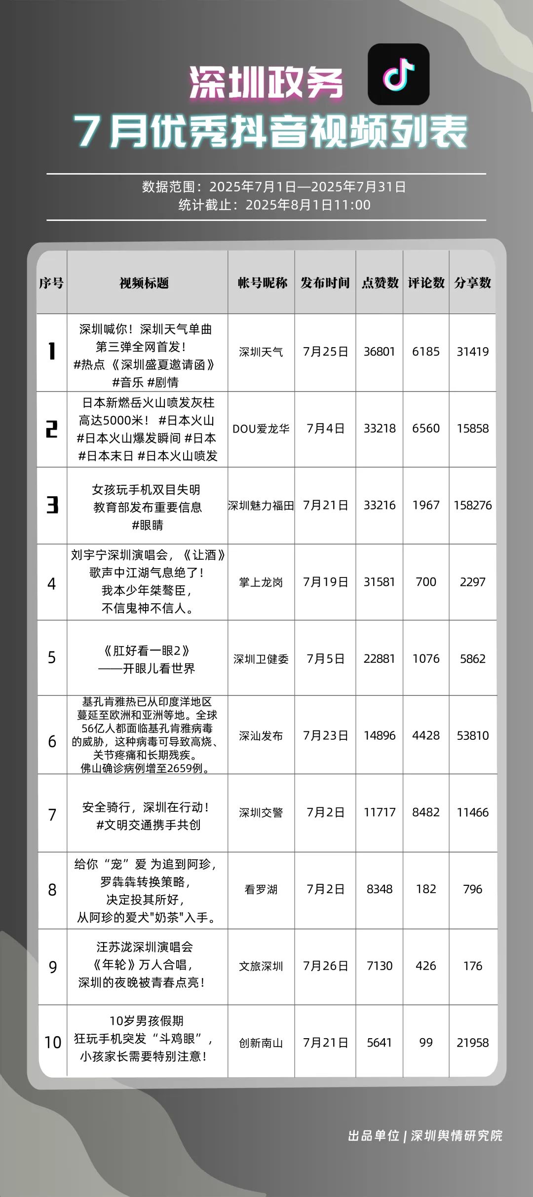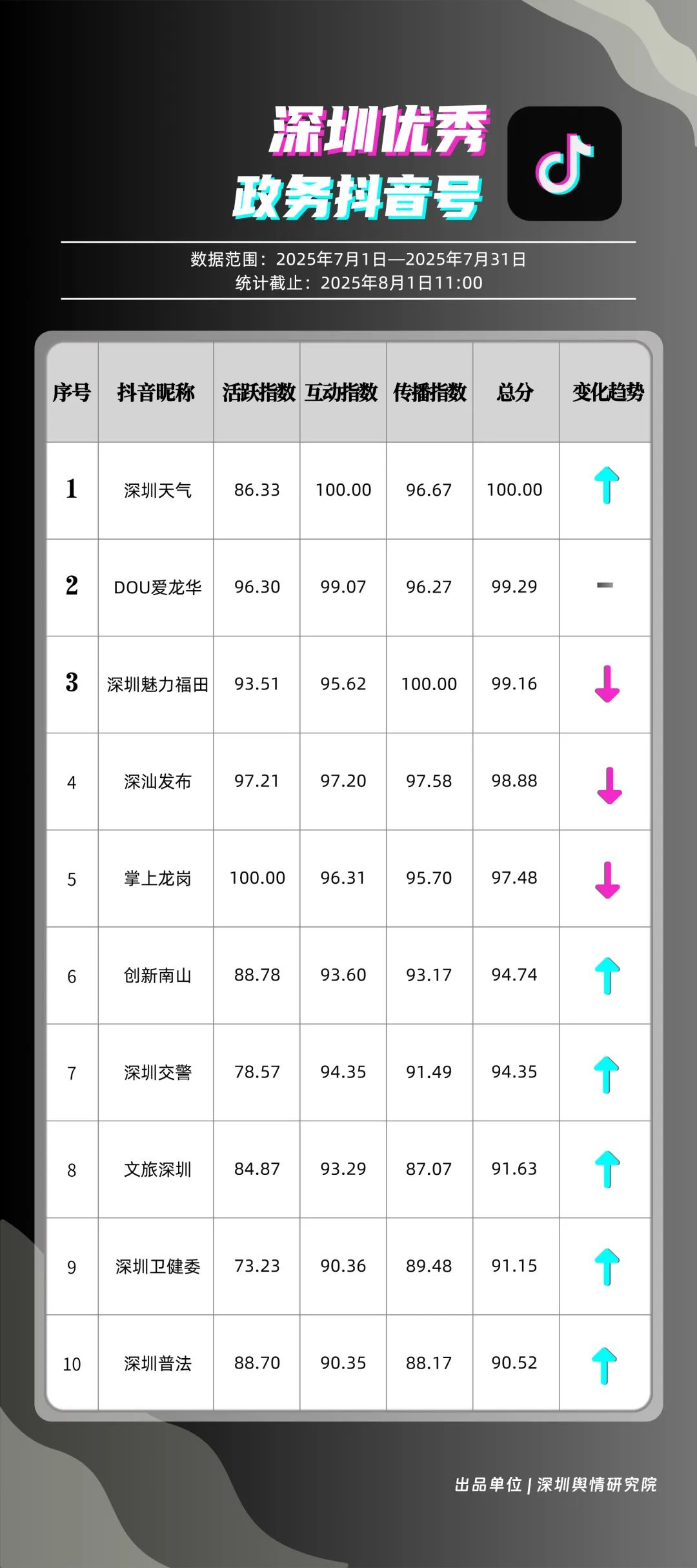 7月,“深圳天氣”“DOU愛(ài)龍華”“深圳魅力福田”“深汕發(fā)布”“掌上龍崗”“創(chuàng)新南山”“深圳交警”“文旅深圳”“深圳衛(wèi)健委”“深圳普法”共10個(gè)政務(wù)抖音號(hào)獲得“優(yōu)秀政務(wù)抖音號(hào)”稱(chēng)號(hào)。其中,“深圳天氣”互動(dòng)指標(biāo)獲滿(mǎn)分,憑借氣象與趣味相結(jié)合的創(chuàng)新科普形式,領(lǐng)跑優(yōu)秀政務(wù)抖音號(hào);“DOU愛(ài)龍華”“深圳魅力福田”分別位列第二、三名,通過(guò)聚焦網(wǎng)絡(luò)熱點(diǎn)、挖掘創(chuàng)意內(nèi)容,不斷提升傳播效能,展現(xiàn)出強(qiáng)大的政務(wù)新媒體影響力;“深汕發(fā)布”“掌上龍崗”“創(chuàng)新南山”等賬號(hào)緊隨其后,上榜的優(yōu)質(zhì)政務(wù)抖音號(hào)用短視頻語(yǔ)言強(qiáng)化傳播效果,展現(xiàn)了鮮明的賬號(hào)特色和風(fēng)采。