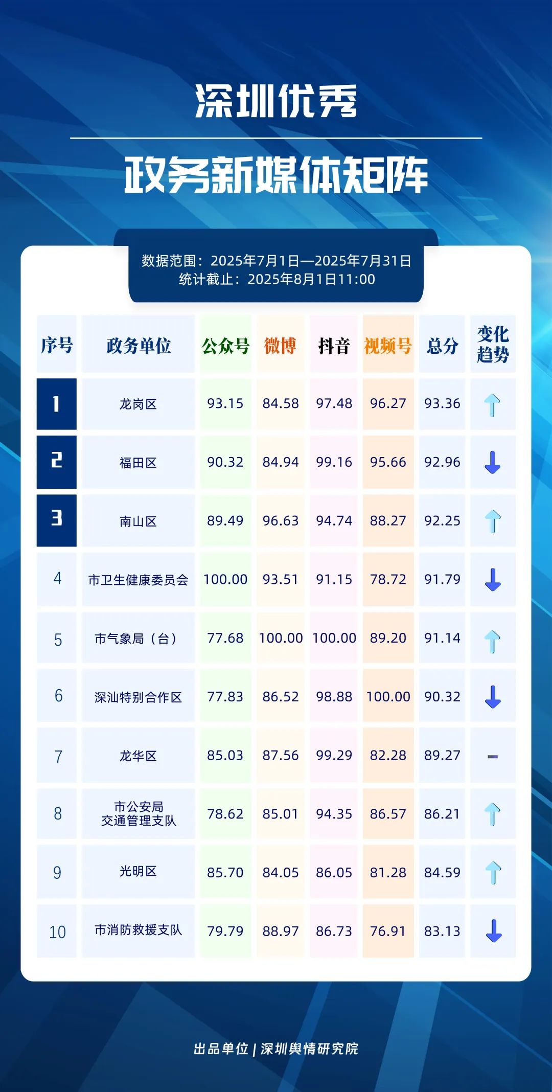 7月,深圳政務(wù)新媒體矩陣各展所長(zhǎng),為市民帶來(lái)豐富實(shí)用的信息服務(wù)。龍崗區(qū)、福田區(qū)、南山區(qū)、市衛(wèi)生健康委員會(huì)、市氣象局(臺(tái))、深汕特別合作區(qū)、龍華區(qū)、市公安局交通管理支隊(duì)、光明區(qū)、市消防救援支隊(duì)的新媒體矩陣入選“深圳優(yōu)秀政務(wù)新媒體矩陣”榜單。值得關(guān)注的是,龍崗區(qū)新媒體矩陣在7月著力提升內(nèi)容質(zhì)量,于抖音和微信視頻號(hào)平臺(tái)得分顯著提高,成功登頂;福田區(qū)新媒體矩陣在抖音平臺(tái)表現(xiàn)突出,位列榜單第二;南山區(qū)新媒體矩陣則在微博和抖音平臺(tái)保持評(píng)分優(yōu)勢(shì)。此外,市氣象局(臺(tái))、市公安局交通管理支隊(duì)和光明區(qū)的排名也實(shí)現(xiàn)明顯上升,體現(xiàn)出政務(wù)新媒體矩陣整體競(jìng)爭(zhēng)力持續(xù)增強(qiáng)。