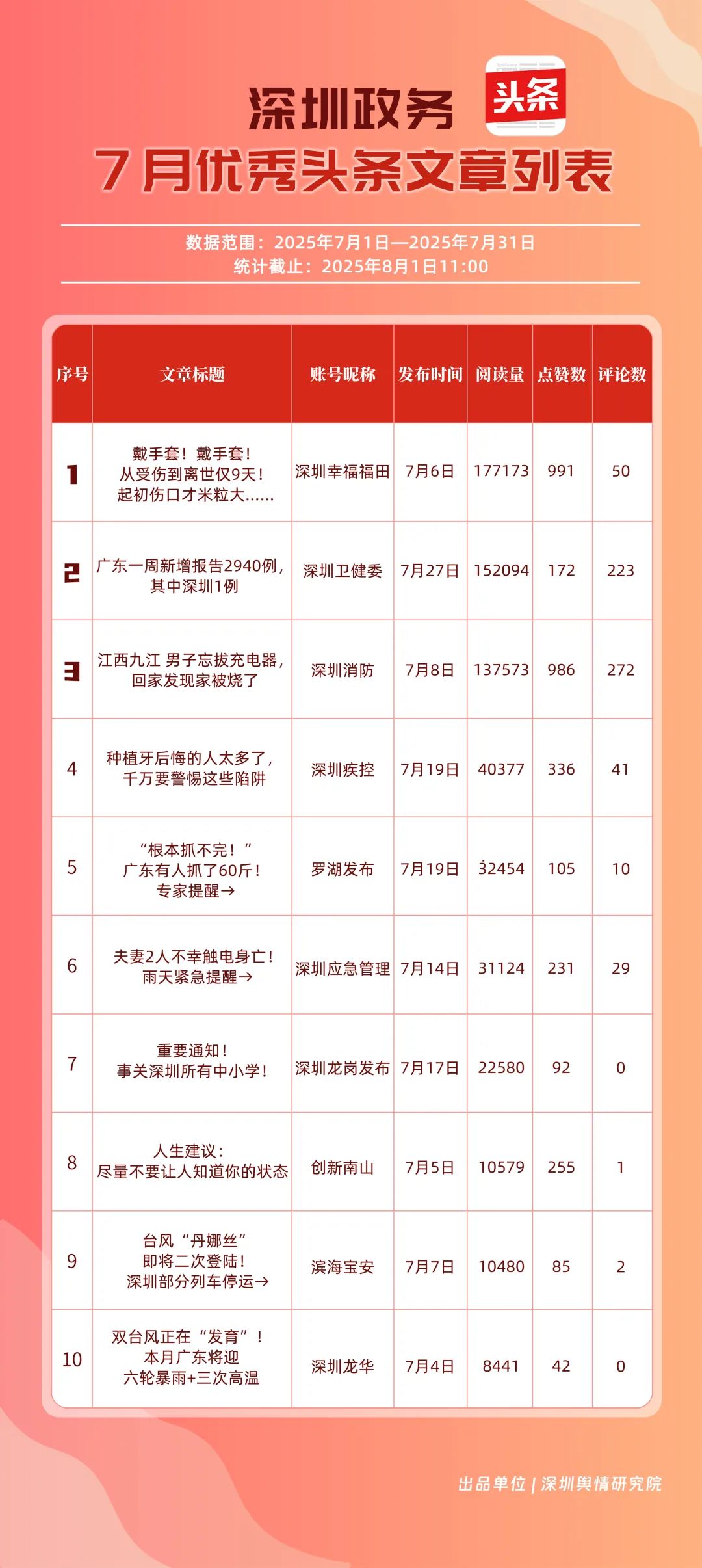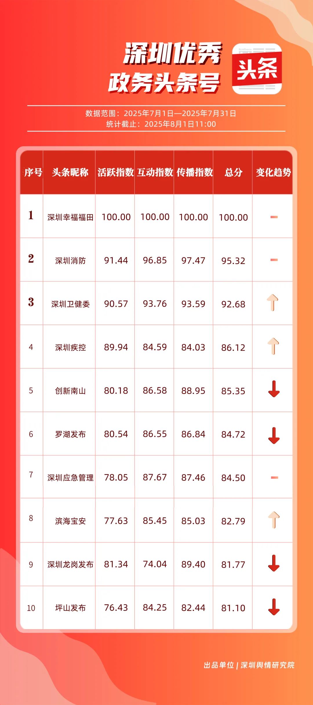 7月,“深圳幸福福田”“深圳消防”“深圳衛(wèi)健委”“深圳疾控”“創(chuàng)新南山”“羅湖發(fā)布”“深圳應(yīng)急管理”“濱海寶安”“深圳龍崗發(fā)布”“坪山發(fā)布”共10個(gè)政務(wù)頭條號(hào)入選“優(yōu)秀政務(wù)頭條號(hào)”榜單?!吧钲谛腋8L铩薄吧钲谙馈睉{借優(yōu)質(zhì)內(nèi)容持續(xù)吸引用戶(hù)關(guān)注,穩(wěn)居前二;“深圳衛(wèi)健委”表現(xiàn)亮眼,評(píng)分達(dá)92.68分,排名較6月有所上升;“深圳疾控”同樣進(jìn)步明顯,在疾病預(yù)防控制信息傳播上發(fā)揮了重要作用?!皠?chuàng)新南山”“羅湖發(fā)布”“深圳應(yīng)急管理”等上榜賬號(hào),也各展所長(zhǎng),始終將優(yōu)質(zhì)內(nèi)容作為核心抓手,成為政務(wù)新媒體領(lǐng)域內(nèi)容創(chuàng)作與傳播的典范。
