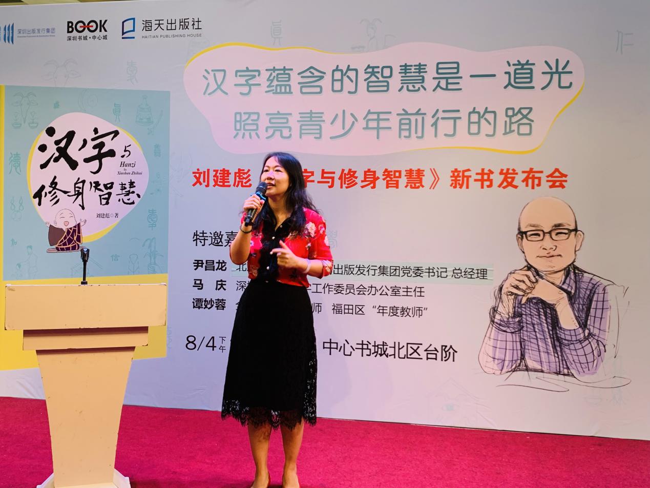 深圳出版發(fā)行集團(tuán)黨委書記、總經(jīng)理尹昌龍?jiān)诎l(fā)言中指出,漢字里蘊(yùn)藏著中華文明的密碼,而《漢字與修身智慧》這本書恰是從漢字出發(fā),解讀中華文化的基因,以美德教育為旨?xì)w,有助于喚起我們對(duì)漢字的熱愛(ài),對(duì)民族文化的自信。他向在場(chǎng)觀眾推薦這本書,并指其信息量大,兼具趣味性、可讀性與啟發(fā)性,值得細(xì)細(xì)品味。另外,馬慶主任表示,漢字投射的是古人的心靈,古人的智慧,古人的修養(yǎng),他贊嘆《漢字與修身智慧》一書為深圳的文化積累做出了貢獻(xiàn),并鼓勵(lì)親子共讀,共同成長(zhǎng)。譚妙蓉老師也力薦此書,認(rèn)為書中漢字心能量中的小故事深入淺出,富含哲理,對(duì)青少年乃至成年人美德教育均有借鑒作用,并聲情并茂地朗誦了書中的《陋室銘》一文,她希望作者將來(lái)能創(chuàng)作出更多關(guān)于漢字的書,讓更多讀者感受到傳統(tǒng)文化的熏陶與滋養(yǎng)。