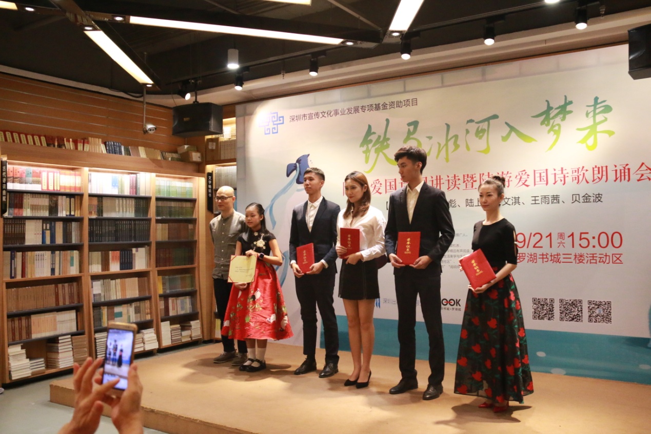 深圳新聞網(wǎng)訊 9月21日下午,由深圳市宣傳文化事業(yè)發(fā)展專(zhuān)項(xiàng)基金資助的“新時(shí)代中華優(yōu)秀傳統(tǒng)文化進(jìn)社區(qū)”項(xiàng)目之“鐵馬冰河入夢(mèng)來(lái)”陸游愛(ài)國(guó)詩(shī)詞公益講座暨陸游愛(ài)國(guó)詩(shī)詞朗誦會(huì)在羅湖書(shū)城三樓活動(dòng)區(qū)成功舉辦。本次活動(dòng)由深圳市壹書(shū)文化傳播有限責(zé)任公司、深圳書(shū)城羅湖城共同主辦,壹書(shū)閱讀推廣人、愛(ài)詩(shī)家創(chuàng)始人劉建彪先生擔(dān)任主講嘉賓?;顒?dòng)尚未開(kāi)始,現(xiàn)場(chǎng)已座無(wú)虛席,觀(guān)眾們對(duì)講座充滿(mǎn)了期待,更有小朋友們朗誦起了陸游的名句。