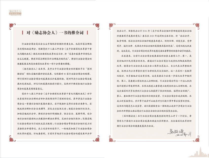清華大學(xué)公益慈善研究院王名教授為此書作序中寫道:感謝深圳,孕育出了中國(guó)改革開放和市場(chǎng)經(jīng)濟(jì)發(fā)展中最發(fā)達(dá)的協(xié)會(huì);感謝深圳的協(xié)會(huì),為一批優(yōu)秀的協(xié)會(huì)人提供了人生和事業(yè)的舞臺(tái)。