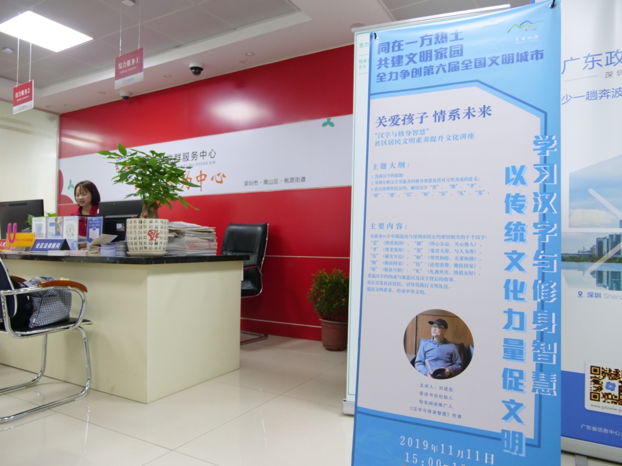 11月11日下午,本系列活動(dòng)的第三場(chǎng)講座在平山社區(qū)工作站拉開了序幕,此次講座由桃源街道黨工委(辦事處)主辦、深圳市壹書文化傳播有限責(zé)任公司承辦、平山社區(qū)黨委協(xié)辦。從2005年起,深圳連續(xù)五次獲得“全國(guó)文明城市”的榮譽(yù)稱號(hào),在爭(zhēng)創(chuàng)第六屆全國(guó)文明城市的關(guān)鍵時(shí)期,桃源街道辦積極響應(yīng)市委市政府的號(hào)召,堅(jiān)持求真務(wù)實(shí)的工作作風(fēng),以“‘同在一方熱土共建文明家園’——全力爭(zhēng)創(chuàng)第六屆全國(guó)文明城市”為文明創(chuàng)建標(biāo)語(yǔ),開展題為“學(xué)習(xí)漢字與修身智慧,以傳統(tǒng)文化力量促文明”的文化講座,為創(chuàng)建文明城市貢獻(xiàn)一份力量。