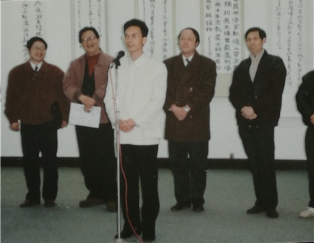 1996年組織深圳市青年書法家赴江蘇省美術(shù)館舉辦《深圳青年書法展》。這是深圳特區(qū)成立以來深圳青年書法家第一次到外省集體亮相交流,圖為金龍在開幕式上致詞。
