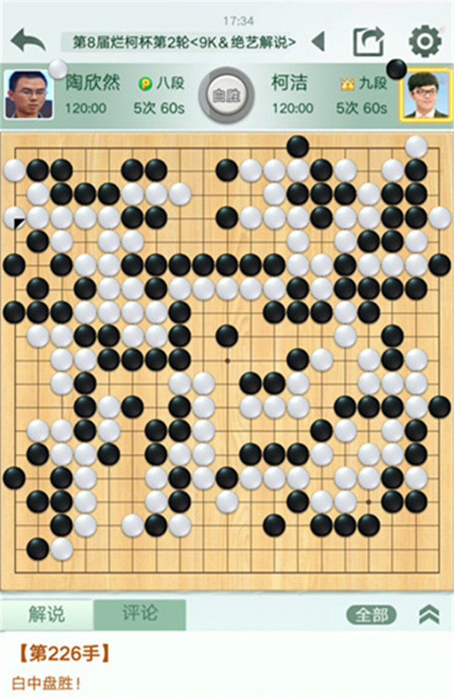本局陶欣然執(zhí)白后行,以極具觀賞性的大模樣開局,將局面導(dǎo)向他擅長的進攻節(jié)奏。在中腹的作戰(zhàn)中,白方判斷精準,棋感敏銳,保持了很高的AI吻合度,一直良好地把握著局面。行至后半盤,黑方柯潔開始了他擅長的逆風(fēng)攪局,多處挑起劫爭。好在陶欣然未出大錯,在混亂的局面下穩(wěn)住了局勢,保持優(yōu)勢直至226手黑方投子認負。