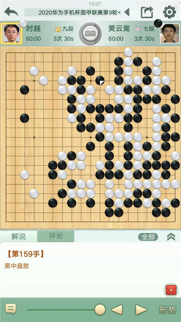 快棋臺由深圳宏發(fā)隊的時越九段執(zhí)白對陣江蘇隊的黃云嵩七段。開局一個局部黑棋應(yīng)對欠妥,白方取得大優(yōu),然而時越之后的下法不夠簡明,被黑棋抓住了機(jī)會,局面變得混亂。在之后雙方大龍的接觸戰(zhàn)中,白方再次放棄簡明做活的下法,與黑棋大龍形成雙活,但結(jié)局是外圍厚薄損失慘重,白棋下成后手雙活之后無暇顧及下方大龍安危,被黑棋一舉擊潰。