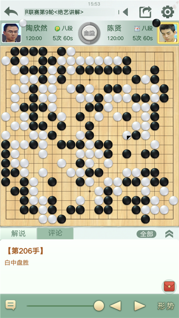 慢棋第一臺由深圳宏發(fā)隊的陶欣然八段執(zhí)白對陣江蘇隊的陳賢八段。雙方開局下出一個復(fù)雜的大型變化,局面一度兩分。序盤結(jié)束時陶欣然下出一步緩手,使得勝負(fù)的天秤向黑方傾斜。弈至官子階段,黑方下出了大意的敗招,單官沖斷白兩塊活棋,相當(dāng)于自停一手,使得白棋追回不少目數(shù)。之后黑棋如繼續(xù)收官局面仍然細(xì)微,但陳賢在出現(xiàn)失誤后心態(tài)失衡,孤注一擲殺白大龍,最終失敗,白棋幸運獲勝。