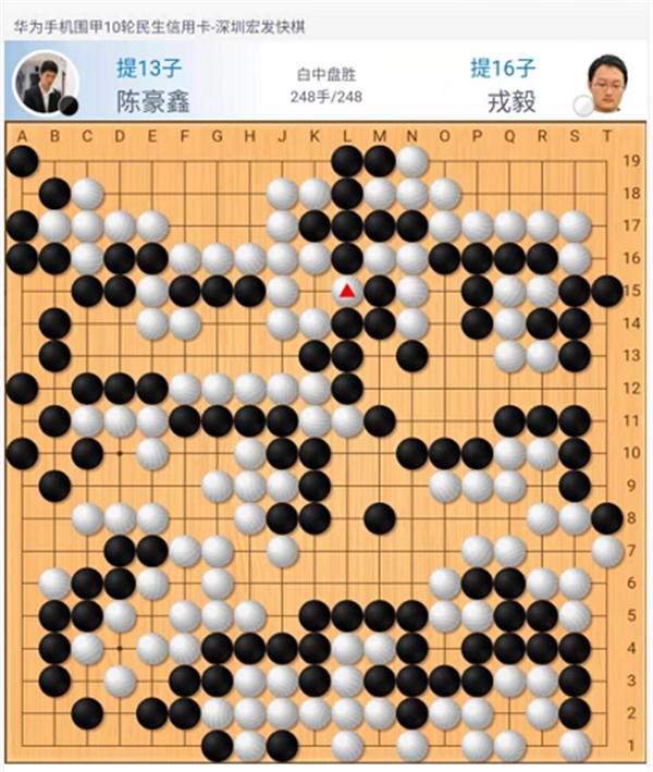 第一臺,快棋,戎毅執(zhí)白勝陳豪鑫。黑棋開局在右邊以及中盤在左上的下法略嫌松緩,白領(lǐng)先。之后黑棋沖擊白棋中央致使左邊形成打劫,白棋簡明處理后以較大優(yōu)勢進(jìn)入官子。最后黑棋為了強(qiáng)撐一目棋在自己空里出現(xiàn)打劫,在黑棋需要找很損的劫材時候黑方認(rèn)輸。