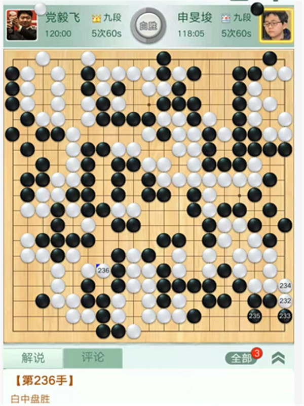 第一臺慢棋,由深圳隊(duì)的外援申旻埈九段執(zhí)黑對陣成都隊(duì)的世界冠軍黨毅飛九段。右下角白棋出現(xiàn)失誤,黑棋沒有抓住機(jī)會(huì)反而被白棋便宜不少。之后黑棋頑強(qiáng)追趕局面一度接近。但是官子階段黑棋始終沒有發(fā)現(xiàn)左上角官子便宜的小巧手,被白消除隱患后,白勝勢。申旻埈執(zhí)黑中盤負(fù)黨毅飛。