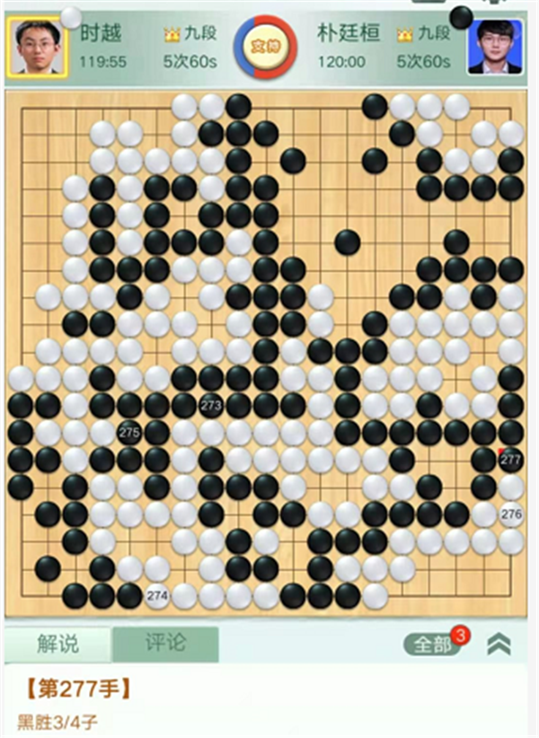 第二臺主將,由深圳隊(duì)時(shí)越九段執(zhí)白對陣成都隊(duì)韓國世界冠軍樸廷桓九段。開局下方雙方各有小失誤,局面均勢。之后左上黑棋行棋過分,白棋領(lǐng)先。白棋在黑右上角破空形成打劫,黑棋連走兩手分開右邊白棋進(jìn)行攻擊。白棋治孤中錯(cuò)失簡明獲勝的下法,但是活出后依然稍好。緊接著白棋沒有選擇最大的官子,被黑棋走到后黑棋領(lǐng)先。之后黑棋官子收束滴水不漏,以最小差距3/4獲勝。時(shí)越執(zhí)白3/4子負(fù)樸廷桓。