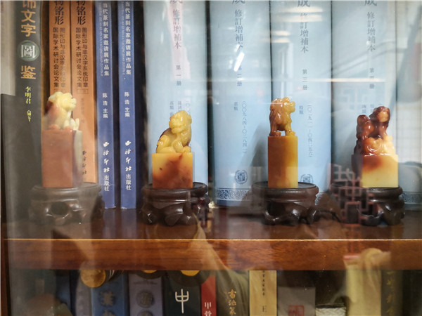 書(shū)房約莫20平米不到,擺設(shè)裝點(diǎn)里透射出寧老師的日常。當(dāng)陽(yáng)光照進(jìn)這間寧?kù)o的小屋,他習(xí)慣于先打開(kāi)音樂(lè),在舒心樂(lè)聲中開(kāi)始他一天讀書(shū)、刻印的生活。累了,在小桌上喝喝茶,或彈上一段古琴,或者玩賞一下他收藏的心愛(ài)鈴鐺。據(jù)介紹,他專門(mén)收藏西北一帶富貴人家的馬鈴,目前有100余個(gè)。寧老師說(shuō),“讀書(shū)、養(yǎng)性、積德、延年”是其志向,井井有條、一絲不茍的書(shū)房就是佐證。長(zhǎng)期的濡養(yǎng),讓人感到寧老師的談吐從容、情趣高雅、思想深刻。映照在篆刻上,寧老師的印作也日漸沉穩(wěn)大氣,除姓名印章外,所刻內(nèi)容啟人心智,如“以正大立心”“以光明行事”“修辭立其誠(chéng)”等等。