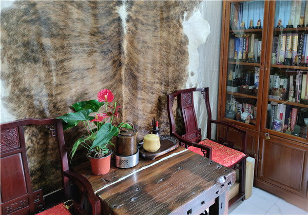俗話說(shuō)得好:見(jiàn)識(shí)一個(gè)素養(yǎng),看看他的書(shū)房就知道了!那么,寧起興老師的書(shū)房是什么樣的呢?第一印象:簡(jiǎn)潔、古樸、有趣味。一眼掃去,臨窗一張紅木桌,兩個(gè)裝得滿滿的老書(shū)柜,兩張烏黑發(fā)亮的南官帽椅,中間配有一張老舊的喝茶的原木桌,正上方的墻面掛著一整張大大的南美阿根廷牛皮。墻上橫掃,掛有“室靜書(shū)馨”的書(shū)法作品,一張古琴,一把薩克斯,幾份有關(guān)他篆刻宣傳的剪報(bào),還有星星點(diǎn)點(diǎn)的各類鈴鐺。細(xì)看呢:書(shū)柜里的篆刻工具書(shū),有大部頭的字典、印譜和系列叢書(shū),也有與篆刻相關(guān)的文化類書(shū)籍,大多插滿了顏色各異的標(biāo)簽,可見(jiàn)寧老師讀書(shū)的細(xì)致與用心。紅木大桌上有一對(duì)大音箱,是原裝進(jìn)口的德國(guó)貨;桌子旁,有一正方形的小桌特別顯眼,寧老師帶著些許自豪的神態(tài)介紹說(shuō),鉗臺(tái)是德國(guó)進(jìn)口的,鋸子也是原裝進(jìn)口的,那個(gè)刻銅印的印盤(pán)是定制的。還有,他所用的刻刀頂端印有l(wèi)ogo,是小篆“寧”字與工字的合寫(xiě),該刀鋼材鈷含量為17%,也是定制的。正所謂“工欲善其事,必先利其器”,寧老師深以為然。是以,他在工具上追求“高精尖”甚至不惜工本。