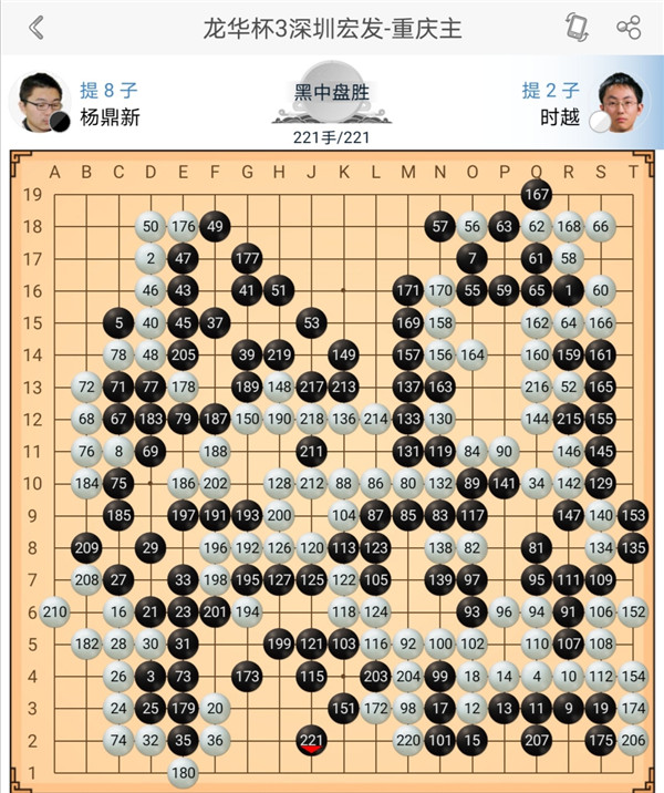 一臺戎毅執(zhí)黑對陣?yán)钴幒?,右上?zhàn)斗后黑棋稍有優(yōu)勢,之后黑棋沖擊中央白棋過分,應(yīng)該慢慢收官,白棋正確應(yīng)對,戰(zhàn)斗中便宜后獲得勝利。二臺主將時越執(zhí)白對陣等級分排名第二的楊鼎新,中盤黑棋打入右邊后形成亂戰(zhàn),白棋失誤比黑棋更多,戰(zhàn)斗結(jié)束進(jìn)入官子時黑勝勢。